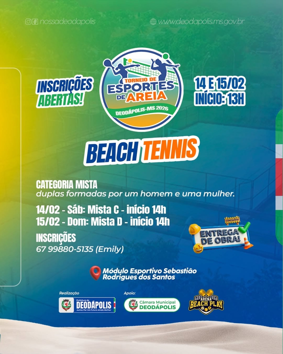A Prefeitura de Deodápolis abriu as inscrições para o beach tênis, modalidade que integra a primeira edição do Torneio de Esportes de Areia Deodápolis-MS 2026, evento que marcará a inauguração das novas quadras de areia do Módulo Esportivo Sebastião Rodrigues dos Santos. O torneio simboliza um novo momento para o esporte no município, celebrando a entrega de uma importante obra esportiva e incentivando a prática esportiva, a convivência e a qualidade de vida da população. A competição será realizada pela primeira vez em Deodápolis e promete reunir atletas, público e amantes do esporte em um ambiente de energia e integração. A modalidade de beach tênis será disputada na categoria mista, com duplas formadas por um homem e uma mulher, divididas nas seguintes datas e categorias: As inscrições já estão abertas e devem ser realizadas exclusivamente pelo WhatsApp, pelo número (67) 99880-5135, com Emily. Os interessados devem montar sua dupla e garantir participação nesse momento histórico para o esporte local. A realização do torneio é da Prefeitura Municipal de Deodápolis, com apoio da Câmara Municipal de Deodápolis e da Arena Beach Play, reforçando o compromisso com o fortalecimento do esporte, do lazer e das políticas públicas voltadas ao bem-estar da população.