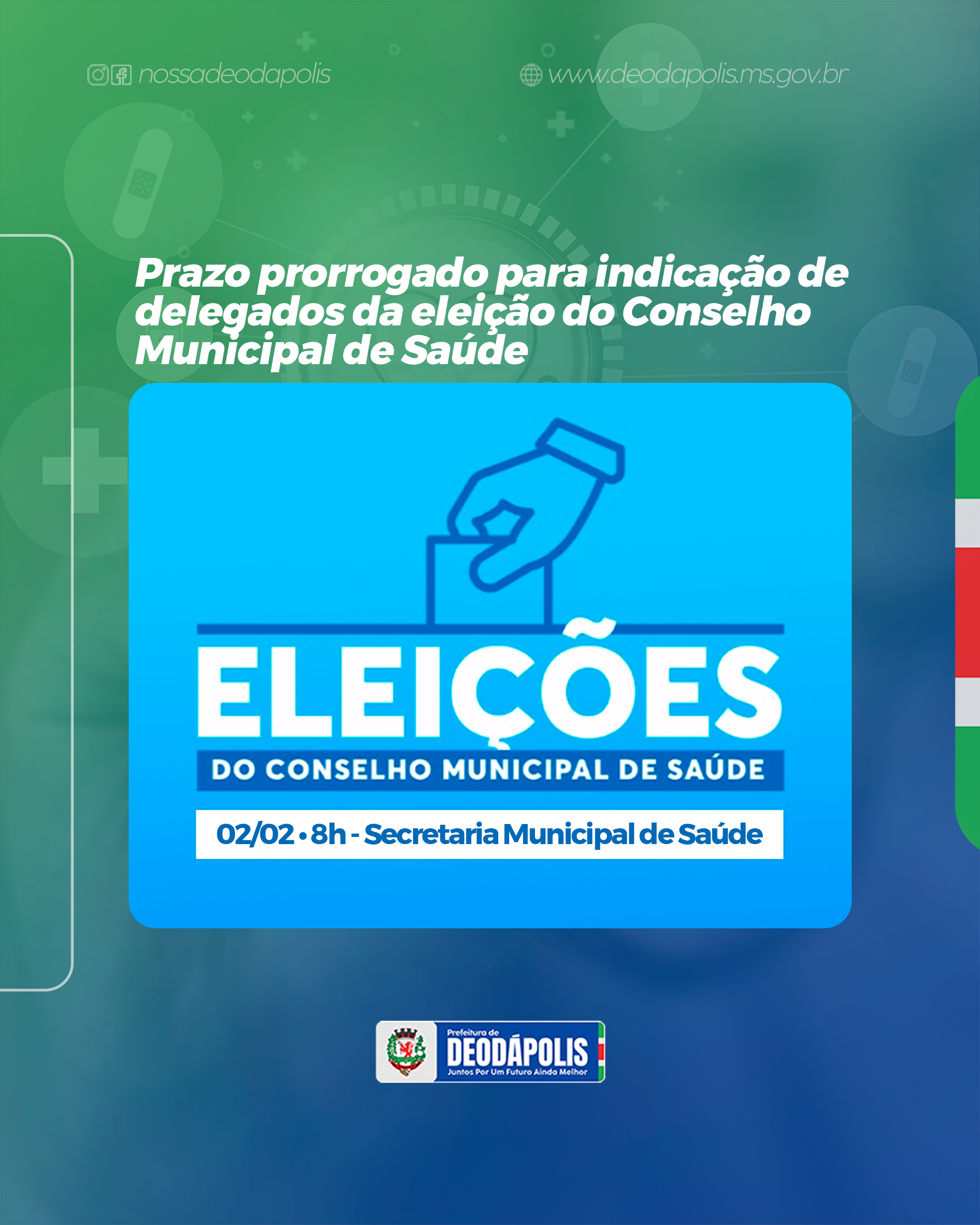 O Conselho Municipal de Saúde (CMS) de Deodápolis informa que foi PRORROGADO o prazo para que instituições, entidades e movimentos sociais participem do processo eleitoral para composição do Conselho Municipal de Saúde, referente ao mandato 2026 a 2028, conforme edital oficial. A eleição tem como objetivo garantir a representatividade dos usuários do SUS, trabalhadores da saúde, gestores e prestadores de serviços, fortalecendo a participação social nas decisões da saúde pública no município. Podem participar do processo entidades e movimentos sociais representativos de: Usuários do SUS; Trabalhadores da área da saúde; Gestores e prestadores de serviços de saúde públicos e privados. As entidades interessadas devem indicar um representante titular para participar da Plenária de Eleição. Novo prazo para inscrições e indicações: até 30 de janeiro de 2026 Horário: até 17h Local: Sala de reunião da Secretaria Municipal de Saúde Inscrição gratuita, sem cobrança de taxa A inscrição será feita mediante protocolo de ofício junto à Comissão Eleitoral, com os dados do representante indicado, conforme formulário disponível no local. A Plenária de Eleição das entidades que irão compor o Conselho Municipal de Saúde será realizada: Data: 02 de fevereiro de 2026 Horário: 8h Local: Sala de reunião da Secretaria Municipal de Saúde de Deodápolis O Conselho Municipal de Saúde reforça a importância da participação das entidades e movimentos sociais, garantindo transparência, controle social e fortalecimento das políticas públicas de saúde no município.Quem pode participar
