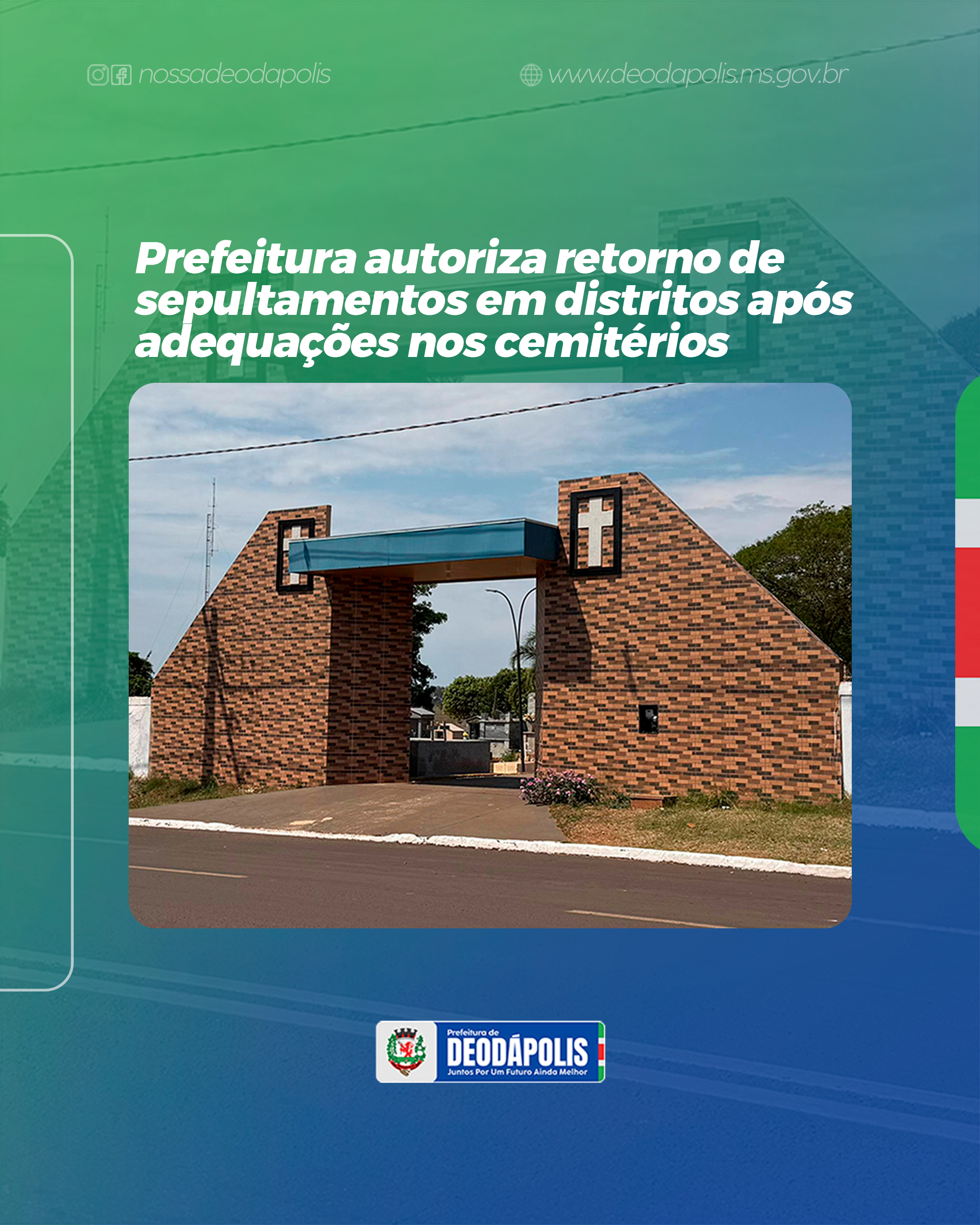A Prefeitura de Deodápolis publicou no Diário Oficial o Decreto nº 031/2026, de 04 de fevereiro de 2026, que autoriza o retorno dos sepultamentos nos cemitérios dos distritos de Lagoa Bonita, Presidente Castelo e Vila União, após a realização de adequações estruturais e sanitárias exigidas pelos órgãos competentes. A medida atende a recomendações do Ministério Público e tem como objetivo garantir sepultamentos dignos às famílias, com segurança sanitária, respeito às normas ambientais e mais organização nos serviços cemiteriais, evitando deslocamentos desnecessários até a sede do município. De acordo com o decreto, os cemitérios que tiveram os sepultamentos retomados passaram por adequações no sistema de covas, adotando um modelo sem contato direto com o solo, com estruturas impermeabilizadas em concreto, atendendo às normas de saúde pública e meio ambiente. O decreto estabelece que todos os sepultamentos deverão ocorrer exclusivamente em jazigos, carneiras ou gavetas impermeabilizadas, com base e vedação adequadas, impedindo infiltrações no solo e garantindo maior controle sanitário. Também foi organizada uma equipe específica para os serviços de sepultamento, além da implantação de um sistema de catalogação e registro eletrônico, assegurando controle, rastreabilidade e transparência dos sepultamentos realizados tanto na sede quanto nos distritos. Já no distrito de Porto Vilma, os sepultamentos permanecem temporariamente suspensos por mais 45 dias, conforme determina o decreto, até a emissão da licença ambiental necessária pelo órgão competente. A liberação ficará condicionada à regularização ambiental, respeitando todas as exigências legais. O decreto ainda prevê a abertura de processo administrativo para a elaboração de projeto e futura reforma e revitalização dos cemitérios dos distritos, incluindo Porto Vilma, além da autorização para construção de um escritório administrativo no cemitério da sede, que vai centralizar os registros, autorizações e o atendimento às famílias. Com essa medida, a Prefeitura reafirma seu compromisso com a dignidade das famílias, a organização dos serviços públicos e o cumprimento rigoroso das normas sanitárias e ambientais.