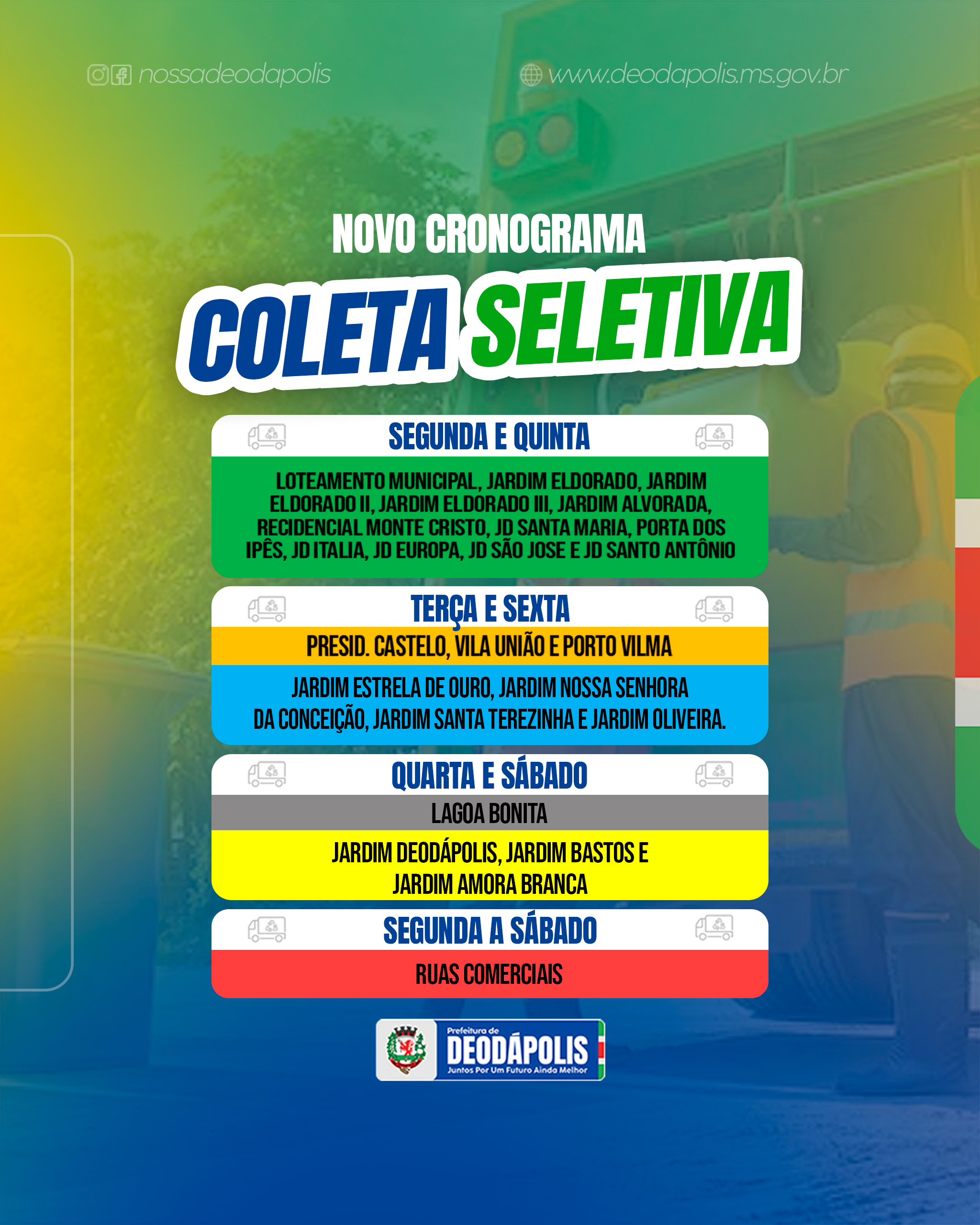A Coleta Seletiva já é realidade em Deodápolis e agora passa a contar com um novo cronograma, ajustado para melhorar a organização do serviço, ampliar o atendimento e garantir mais eficiência na coleta dos resíduos recicláveis. Com a atualização do cronograma, a população pode conferir os dias corretos de coleta em cada bairro e também nos distritos, conforme o mapa divulgado. A mudança foi pensada para otimizar as rotas, facilitar a participação dos moradores e fortalecer o funcionamento do programa. Entre os dias 10 e 15 de fevereiro, as equipes seguem realizando a entrega das sacolas da coleta seletiva nas residências, além de orientar a população sobre a separação correta dos resíduos. A Coleta Seletiva incentiva a separação entre resíduos secos recicláveis, como papel, plástico, metal e vidro, e resíduos orgânicos, como restos de comida, que não devem ser colocados nas sacolas de reciclagem. Separar o lixo é uma atitude simples, mas que gera impactos positivos para o meio ambiente, contribui com a limpeza da cidade e valoriza o trabalho de quem atua diariamente na coleta. A Prefeitura reforça que a colaboração da população é fundamental para o sucesso do programa e para a construção de uma Deodápolis mais limpa, consciente e sustentável.