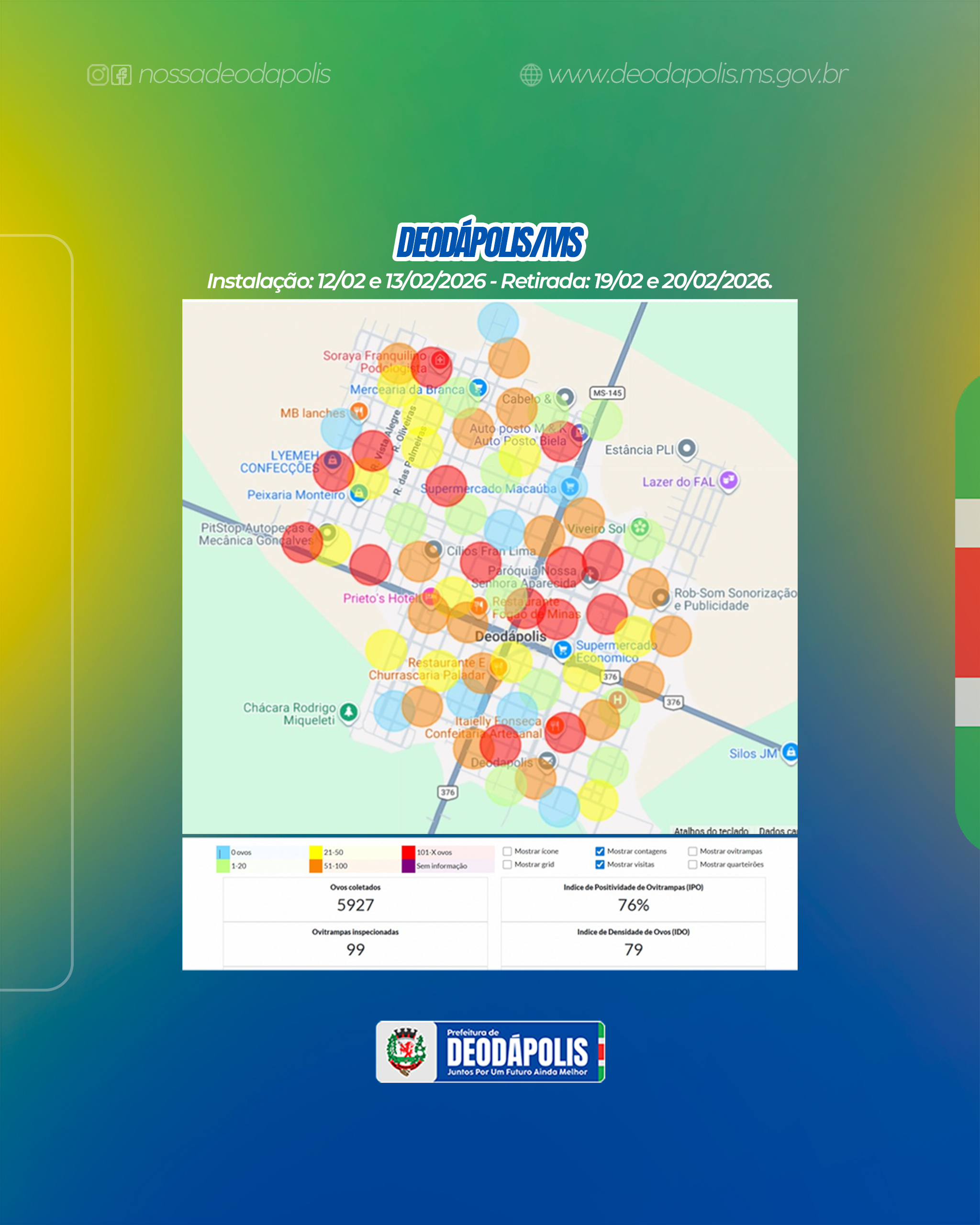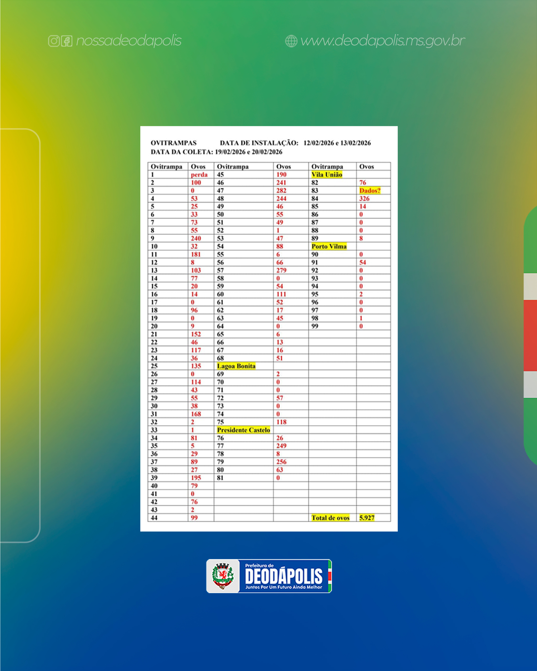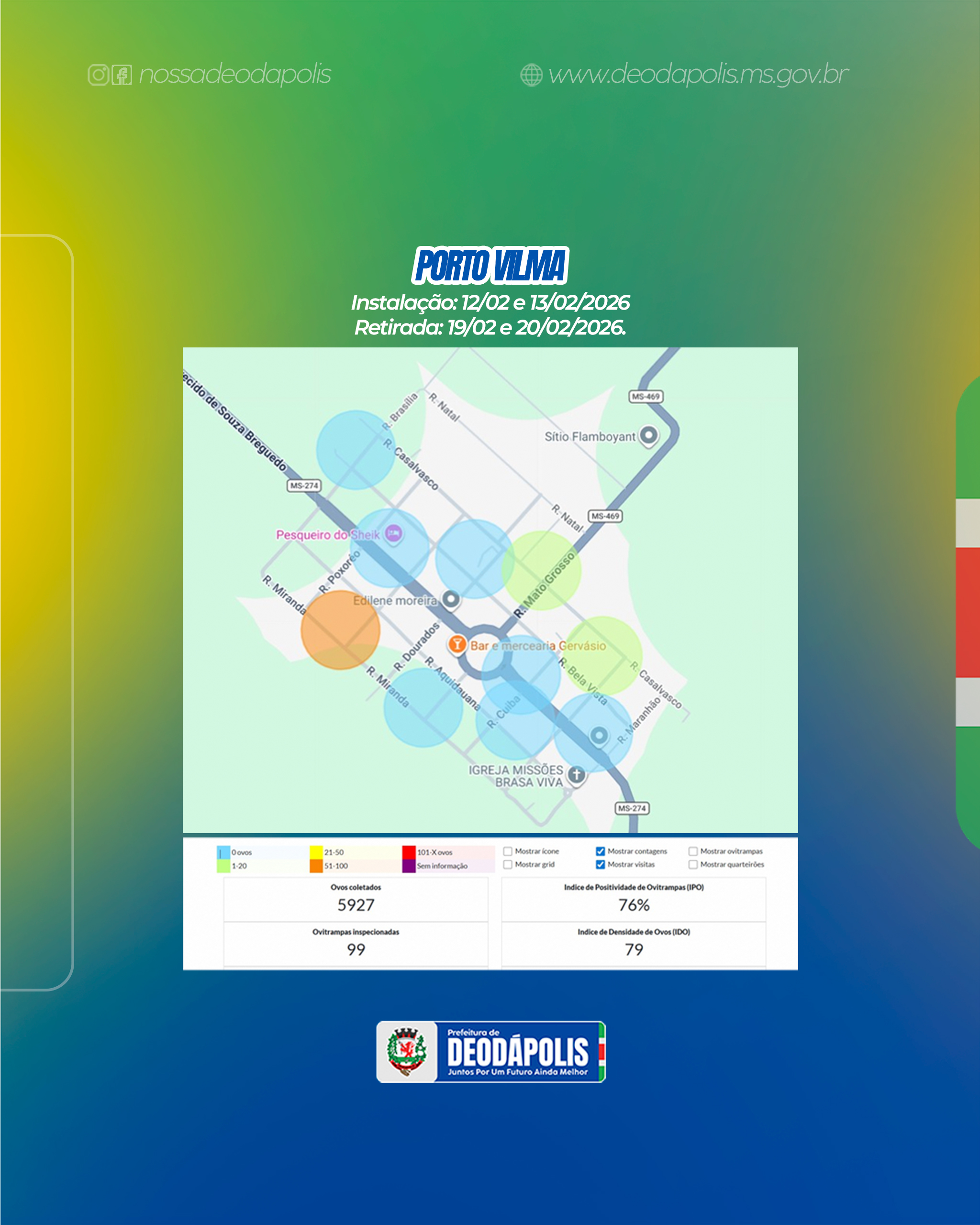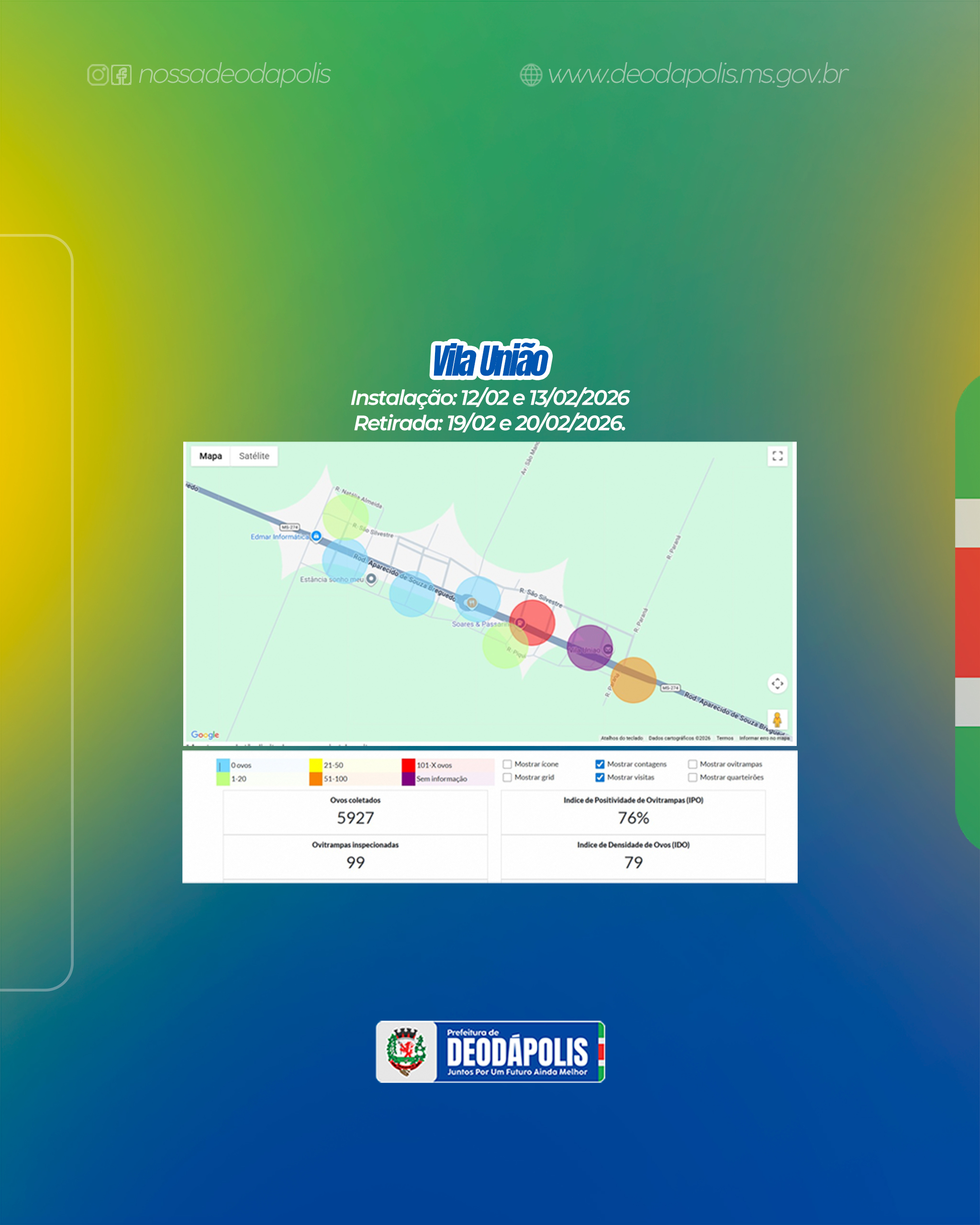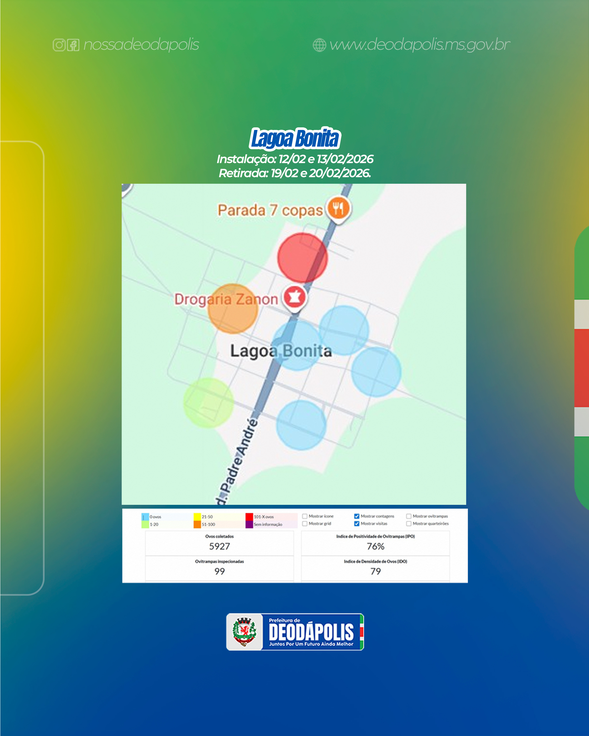 A equipe de Controle de Vetores realizou um novo monitoramento por ovitrampas entre os dias 12 e 20 de fevereiro de 2026 na sede do município e nos distritos de Lagoa Bonita, Presidente Castelo, Vila União e Porto Vilma. As ovitrampas são armadilhas utilizadas para identificar onde o mosquito Aedes aegypti tenta depositar seus ovos. Com esse método, é possível mapear as áreas com maior presença do vetor e direcionar as ações de combate de forma mais precisa e eficiente. O resultado apontou situação semelhante à observada em janeiro, com alguns pontos apresentando maior concentração de ovos, indicando maior circulação do mosquito nessas regiões. Os dados são apresentados em mapa de calor, possibilitando o acompanhamento da população e orientando as equipes nas ações preventivas. Interpretação do mapa (anexos): Vermelho: 101 ou mais ovos por paleta Laranja: 51 a 100 ovos Amarelo: 21 a 50 ovos Verde: 01 a 20 ovos Azul: nenhum ovo encontrado O levantamento foi realizado com instalação das armadilhas em 12/02/2026 e retirada nos dias 19 e 20/02/2026. A Prefeitura reforça que a participação da população é fundamental no combate ao mosquito. É importante manter quintais limpos, eliminar recipientes com água parada, limpar calhas regularmente e comunicar possíveis focos às equipes responsáveis. O monitoramento seguirá sendo realizado de forma contínua, contribuindo para a proteção da saúde pública e prevenção das arboviroses no município.