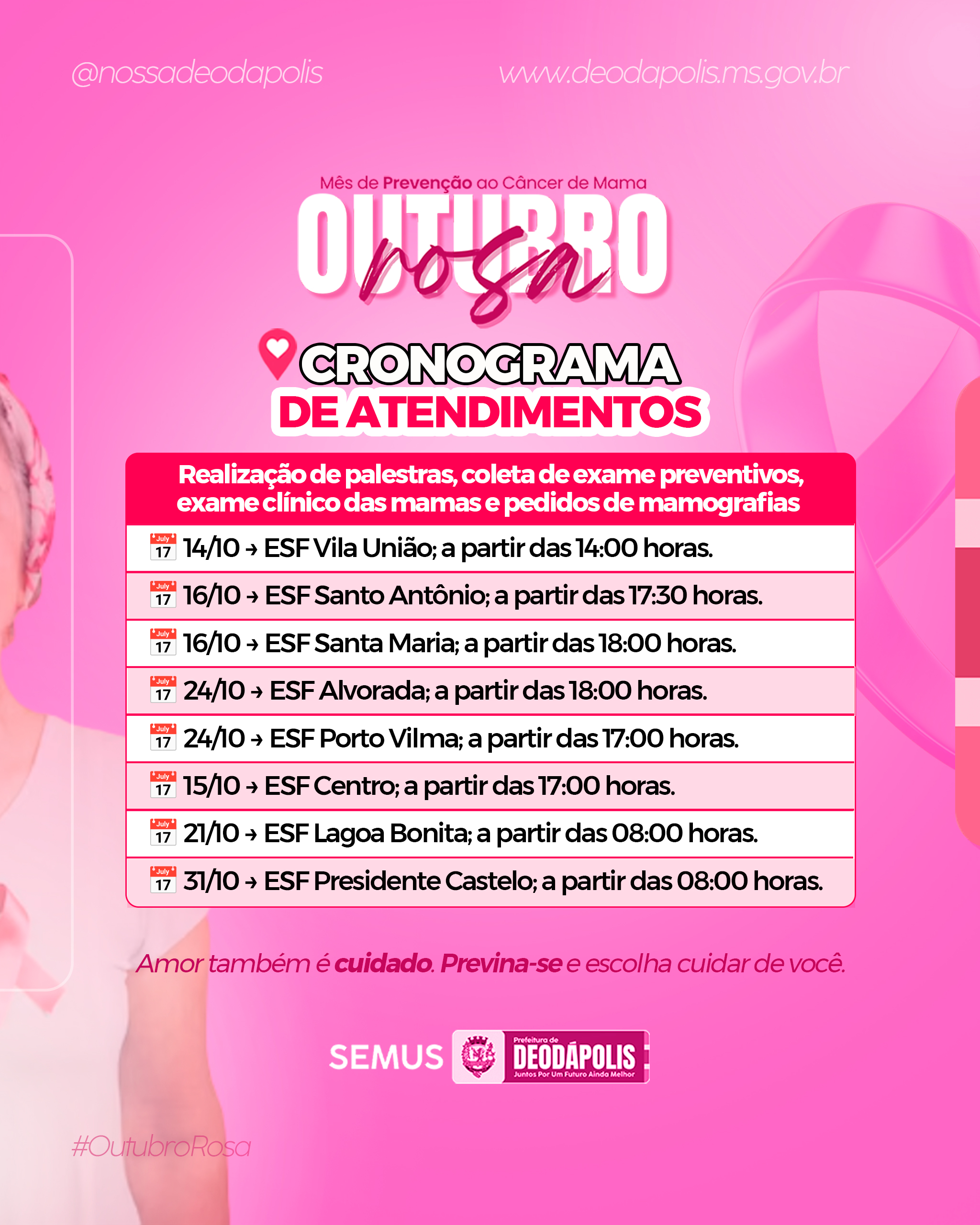 A Prefeitura de Deodápolis, por meio da Secretaria Municipal de Saúde (SEMUS), realiza ao longo do mês de outubro a campanha Outubro Rosa, movimento dedicado à conscientização, prevenção e diagnóstico precoce do câncer de mama. Durante o mês, as unidades de saúde do município promovem palestras, coletas de exames preventivos, exame clínico das mamas e pedidos de mamografias, fortalecendo o compromisso com a saúde e o bem-estar das mulheres. O principal objetivo da campanha é incentivar o autocuidado, reforçar a importância da detecção precoce e orientar sobre a realização dos exames de rotina, que aumentam as chances de um tratamento bem-sucedido. Confira o cronograma completo das ações do Outubro Rosa em Deodápolis: A campanha reforça o compromisso da Administração Municipal em promover ações voltadas à prevenção e à qualidade de vida, aproximando a comunidade dos serviços de saúde e incentivando as mulheres a não deixarem sua saúde para depois.