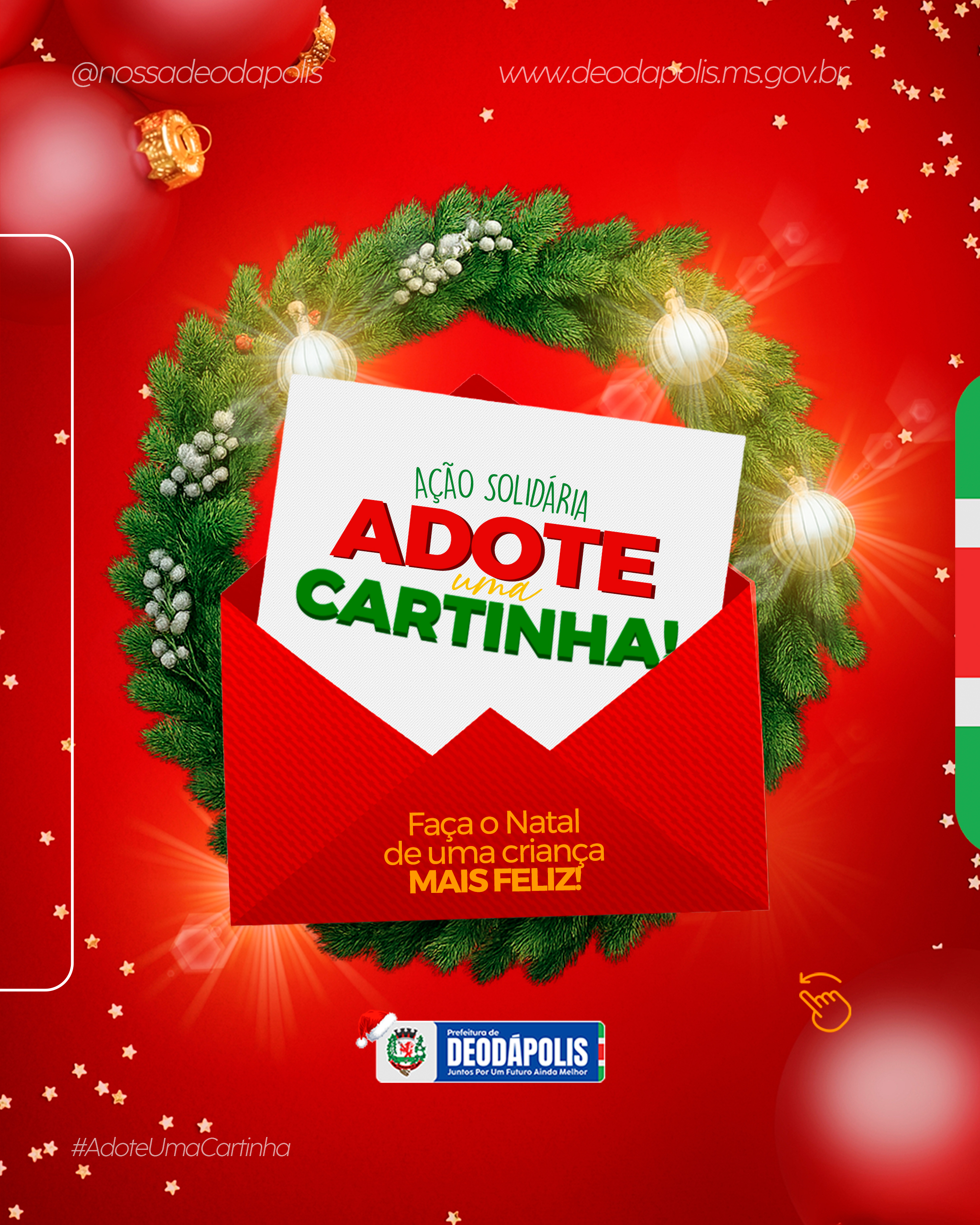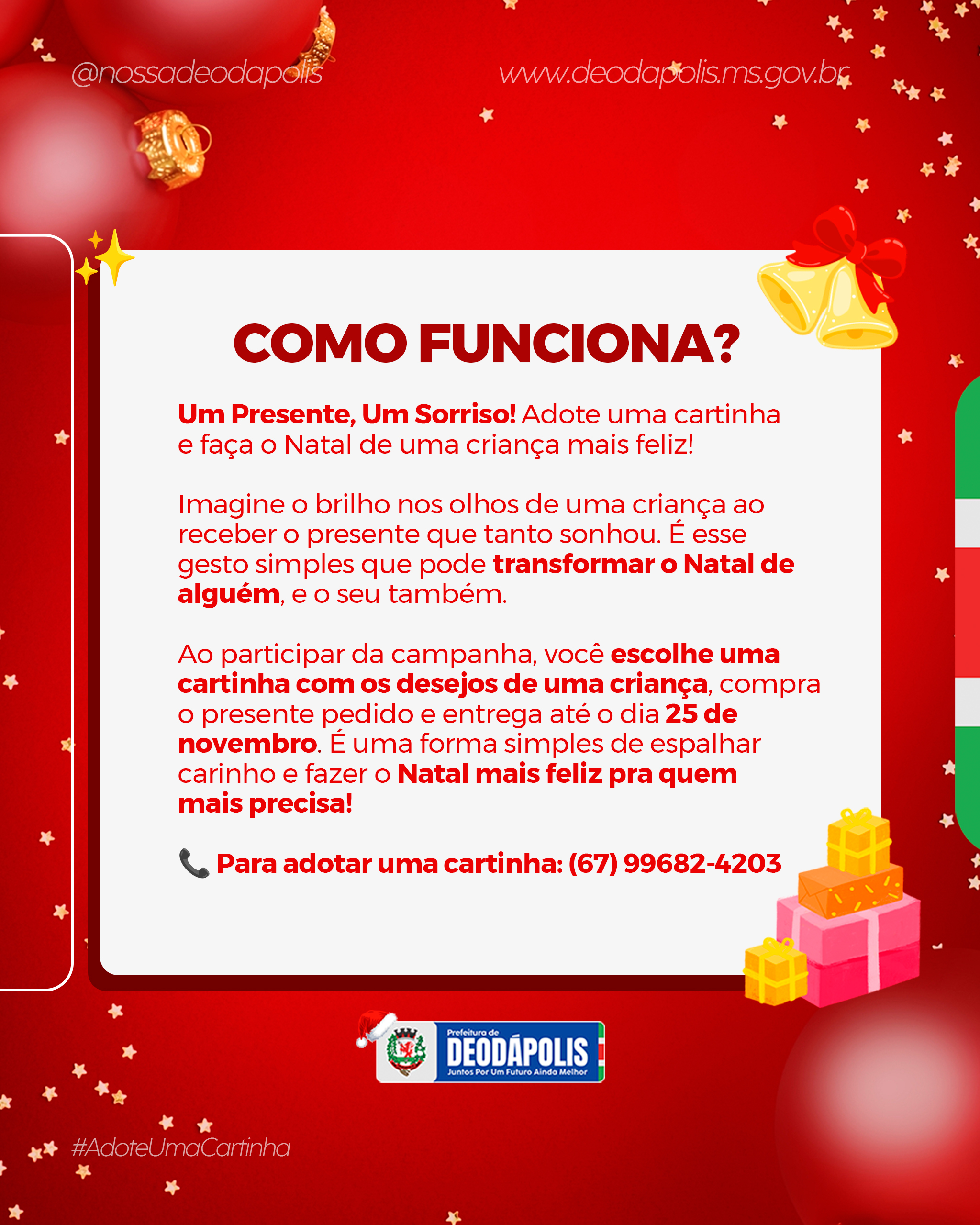 O espírito natalino já começou em Deodápolis, e com ele vem a oportunidade de fazer a diferença na vida de uma criança. A Secretaria Municipal de Assistência Social deu início à campanha “Um Presente, Um Sorriso”, que convida a comunidade a adotar uma cartinha e realizar o sonho de crianças atendidas pelos programas sociais do município. A iniciativa busca espalhar amor, esperança e solidariedade, permitindo que cada morador contribua com um gesto simples, mas cheio de significado. Mais do que um presente, é um ato de carinho que marca tanto quem recebe quanto quem participa. Para participar, basta entrar em contato pelo número (67) 99682-4203 e escolher uma cartinha. Assim, o participante conhecerá o desejo de uma criança e poderá comprar o presente que desejar doar. Os presentes devem ser entregues até o dia 25 de novembro de 2025, acompanhados, se possível, de uma mensagem especial. A equipe da Secretaria de Assistência Social será responsável por entregar os presentes às crianças, garantindo que a magia e a alegria do Natal cheguem a cada lar. A campanha reforça o compromisso da Prefeitura de Deodápolis em promover ações que fortalecem o vínculo social e despertam o espírito de solidariedade entre a comunidade.