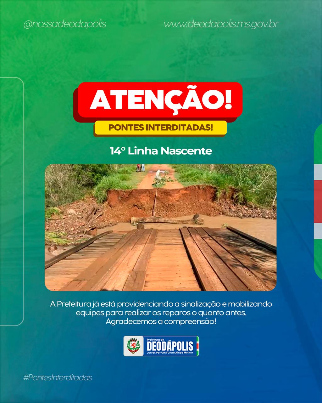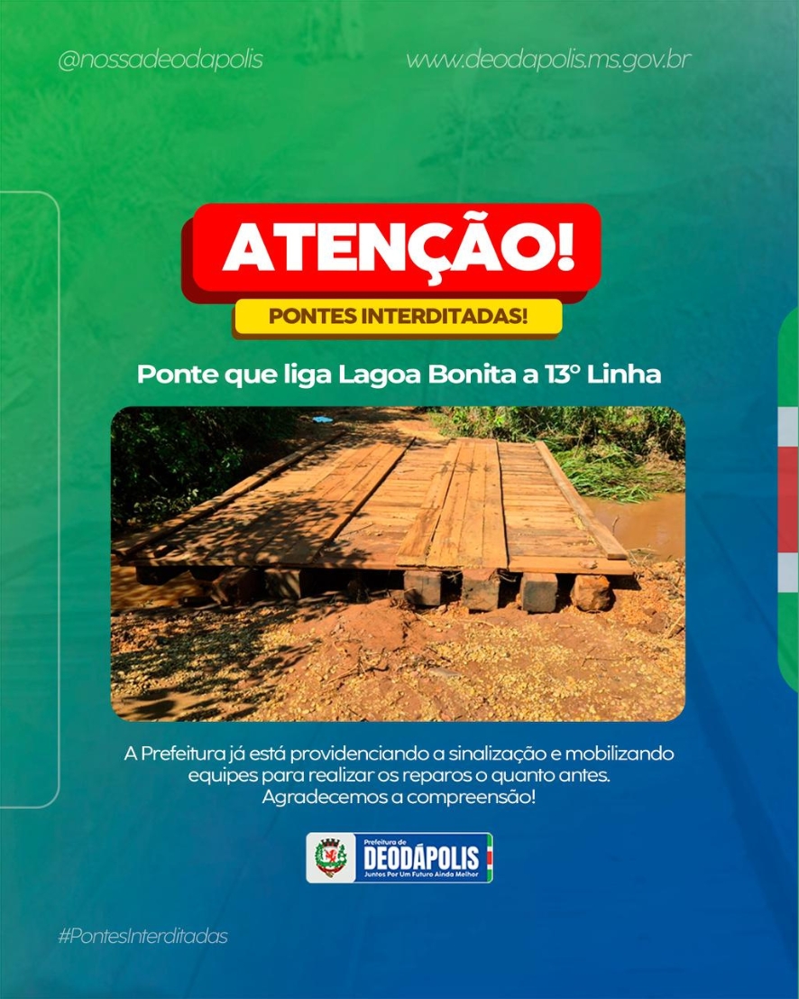As fortes chuvas dos últimos dias causaram danos em duas pontes do município de Deodápolis, levando à interdição temporária das estruturas para garantir a segurança da população. A ponte da 14ª Linha Nascente acabou cedendo e precisou ser interditada. Já a ponte que liga o Distrito de Lagoa Bonita à 13ª Linha sofreu deslocamento na estrutura de madeira, também exigindo bloqueio total do tráfego. A Prefeitura de Deodápolis já está providenciando a sinalização e a orientação aos motoristas, além de realizar a comunicação nos meios oficiais para informar a população sobre as interdições. As equipes de infraestrutura estão se organizando para realizar os reparos o mais breve possível. Esses transtornos são consequência das chuvas intensas que atingiram o município nos últimos dias. A Prefeitura reforça que já está em andamento um plano para substituir pontes de madeira por pontes de concreto, garantindo mais segurança, durabilidade e tranquilidade aos moradores das áreas rurais. A administração municipal agradece a compreensão da população e destaca que todas as medidas necessárias estão sendo tomadas com prioridade e responsabilidade.