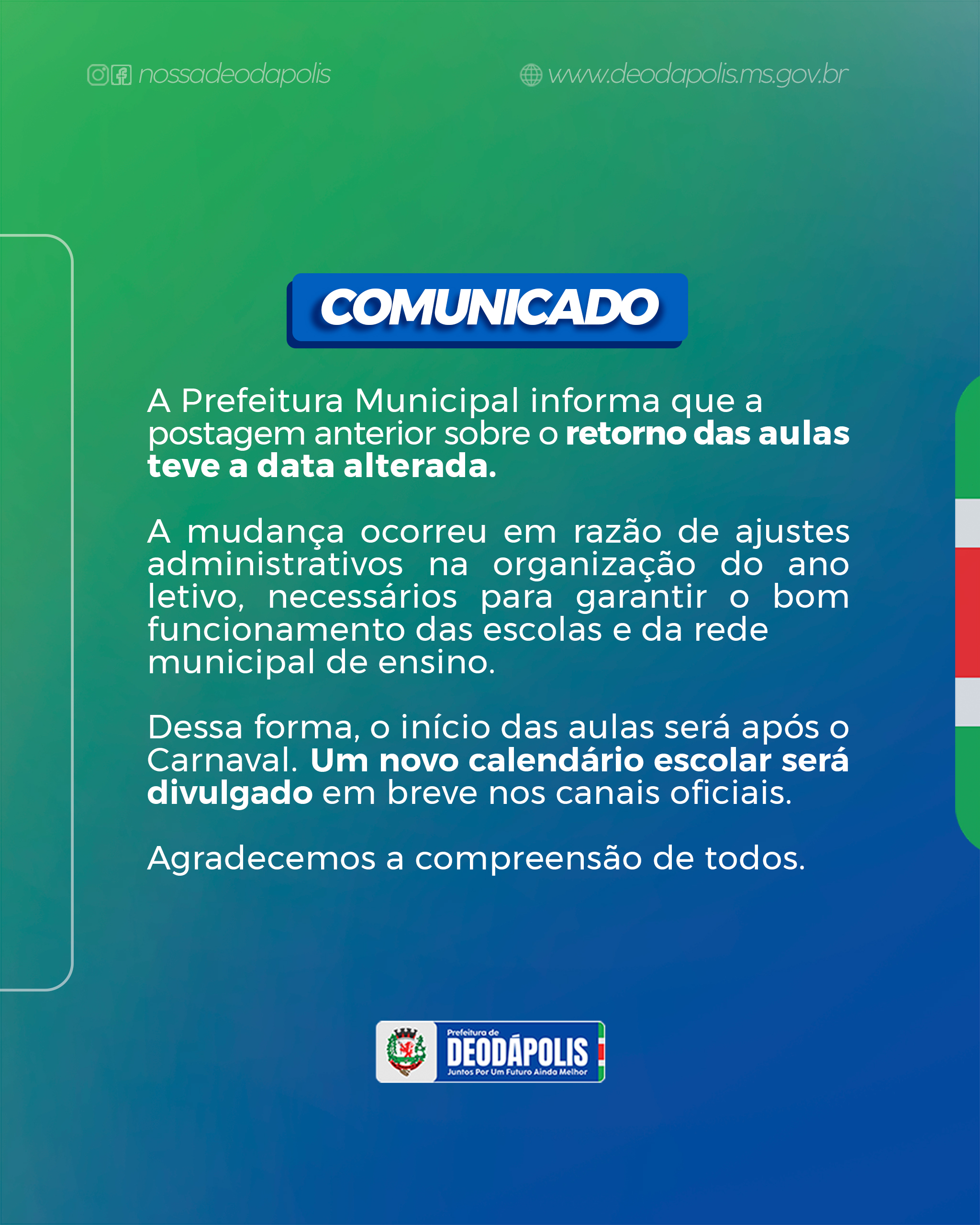 A Prefeitura Municipal informa que a postagem anterior sobre o retorno das aulas teve a data alterada. A mudança ocorreu em razão de ajustes administrativos na organização do ano letivo, necessários para garantir o bom funcionamento das escolas e da rede municipal de ensino. Dessa forma, o início das aulas será após o Carnaval. Um novo calendário escolar será divulgado em breve nos canais oficiais. Agradecemos a compreensão de todos.