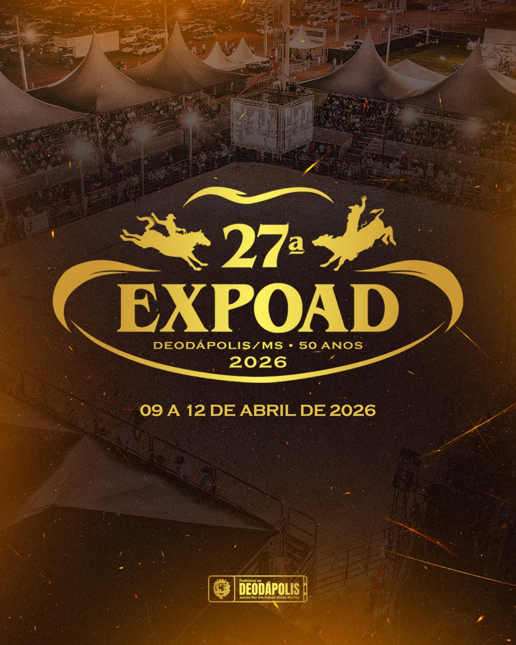 Deodápolis já pode começar a contagem regressiva. De 9 a 12 de abril, acontece a 27ª EXPOAD, um evento especial que celebra os 50 anos do município, em uma verdadeira época de ouro que ficará marcada na história. A EXPOAD é muito mais que uma festa. É um momento aguardado por gerações, que reúne tradição, cultura, rodeio, música e o orgulho de ser de Deodápolis. A edição de 2026 promete ser incrível, emocionante e inesquecível, valorizando a identidade do nosso povo e a força do agro. As atrações oficiais serão divulgadas em breve, aumentando ainda mais a expectativa para um evento que promete movimentar a cidade, receber visitantes de toda a região e celebrar meio século de história com grandeza. A marca da 27ª EXPOAD nasce da essência do nosso interior, onde a cultura do campo pulsa forte e o rodeio é mais que espetáculo, é identidade. O formato que remete ao chapéu simboliza o homem e a mulher da lida, a tradição sertaneja e o orgulho da pecuária que moldaram a história de Deodápolis. As montarias em cavalo e em touro representam duas grandes paixões do nosso povo, modalidades que projetam o município além de suas fronteiras, sendo reconhecidas no país e no mundo, especialmente na força do cutiano, que se tornou marca registrada da nossa terra. O dourado traduz este momento especial: os 50 anos de Deodápolis e uma verdadeira época de ouro marcada por crescimento, desenvolvimento e novas conquistas. A 27ª EXPOAD carrega esse espírito de evolução sem perder suas raízes, unindo tradição e futuro em um só símbolo. Mais que um evento, essa marca representa a celebração da nossa história, da nossa gente e da força do agro, reafirmando Deodápolis como terra de trabalho, paixão pelo rodeio e orgulho. A 27ª EXPOAD será um marco na história do município, celebrando o passado, vivendo o presente e projetando o futuro de uma cidade que cresce sem perder suas raízes. Deodápolis se prepara para viver quatro dias de festa, emoção e orgulho, à altura dos seus 50 anos.A identidade da 27ª EXPOAD