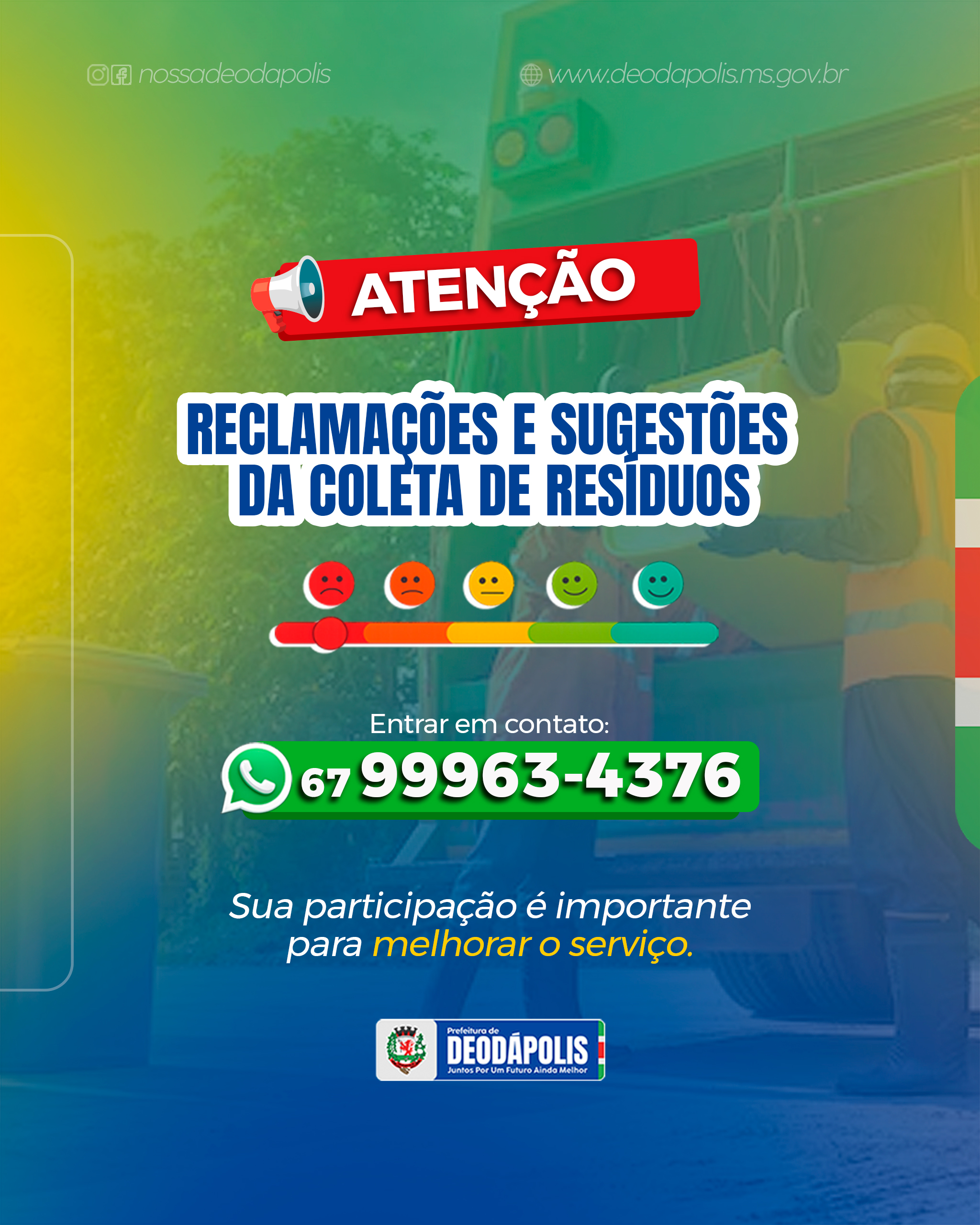 A Prefeitura de Deodápolis reforça à população que está disponível um canal direto para dúvidas, sugestões e reclamações relacionadas ao serviço de coleta de lixo no município. Situações como coleta que não passou no dia previsto, lixo que ficou para trás, atrasos, mudanças de rota ou qualquer outra dúvida sobre o serviço podem e devem ser comunicadas para que a equipe responsável possa verificar e solucionar o problema. O contato pode ser feito de forma simples e rápida pelo WhatsApp, garantindo mais agilidade no atendimento e contribuindo para a melhoria contínua do serviço. Contato para dúvidas, sugestões ou reclamações: A participação da população é fundamental para manter Deodápolis mais limpa, organizada e com serviços públicos cada vez mais eficientes
