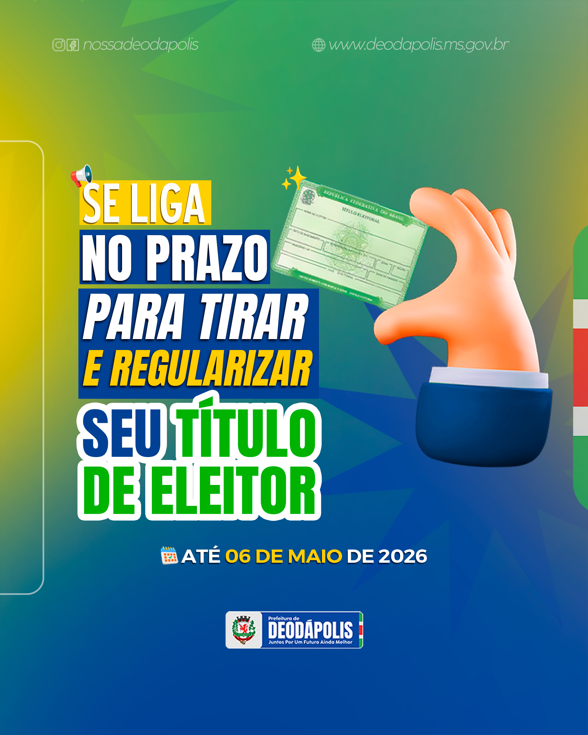 Os moradores de Deodápolis devem ficar atentos: o prazo para tirar o Título de Eleitor, regularizar pendências ou transferir o domicílio eleitoral vai até o dia 6 de maio. Após essa data, o cadastro eleitoral será fechado para a organização das eleições. O título é o documento que garante o direito de votar e ser votado, além de ser exigido em diversas situações, como posse em concurso público, emissão de passaporte, matrícula em instituições públicas e regularização do CPF. Jovens a partir dos 15 anos, desde que completem 16 anos até a data da eleição; Cidadãos com 18 anos ou mais (voto obrigatório até os 70 anos); Eleitores que precisam regularizar pendências; Quem deseja transferir o título para outro município. O atendimento pode ser realizado: Online, pelo site do Tribunal Superior Eleitoral, por meio do Autoatendimento Eleitoral; Presencialmente no cartório eleitoral responsável pela região. Quem fizer o primeiro título pela internet deverá comparecer posteriormente ao cartório para a coleta da biometria, quando convocado pela Justiça Eleitoral. Não deixe para a última hora. Regularizar o título dentro do prazo é garantir sua participação nas decisões que impactam o município, o estado e o país.Quem pode solicitar: