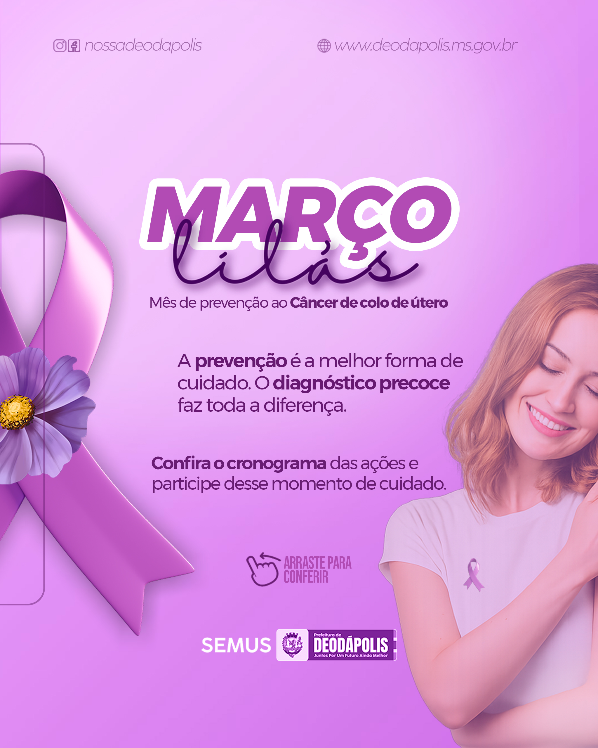 A Prefeitura Municipal de Deodápolis, por meio da Secretaria Municipal de Saúde, promove durante o mês de março uma série de ações em alusão ao Março Lilás, campanha dedicada à conscientização e prevenção do câncer do colo do útero. As atividades acontecem nas Estratégias de Saúde da Família (ESFs) do município e incluem coleta de exames preventivos, orientações sobre saúde da mulher e vacinação contra o HPV. A vacina é destinada a meninas entre 9 e 19 anos, contribuindo para a prevenção de doenças relacionadas ao vírus. Além das ações realizadas nas unidades nas datas programadas, as mulheres também podem agendar a coleta do exame preventivo diretamente nas ESFs, facilitando o acesso ao atendimento e incentivando a realização do exame de rotina. A primeira ação já foi realizada nesta sexta-feira (06/03), na ESF Santa Maria, com atendimento à população e atividades voltadas à prevenção e orientação. No dia 10 de março de 2026, a ação acontece na ESF Lagoa Bonita, a partir das 13h00, com atividades do Março Lilás e pesagem do programa Bolsa Família, ampliando o atendimento e os serviços oferecidos à comunidade. A iniciativa tem como objetivo incentivar a prevenção, ampliar o acesso aos serviços de saúde e reforçar a importância da realização do exame preventivo, essencial para o diagnóstico precoce e o cuidado com a saúde da mulher. Cronograma das ações nas ESFs 06/03 – ESF Santa Maria – a partir das 07h30 10/03/2026 – ESF Lagoa Bonita – Março Lilás e pesagem do Bolsa Família – a partir das 13h00 11/03 – ESF Professora Juvelina – a partir das 13h00 17/03 – ESF Centro – a partir das 18h00 18/03 – ESF Vila União – a partir das 17h00 19/03 – ESF Santo Antônio – a partir das 17h30 24/03 – ESF Porto Vilma – a partir das 17h30 27/03 – ESF Alvorada – a partir das 18h00 A Secretaria Municipal de Saúde reforça que a prevenção e o diagnóstico precoce são fundamentais para a saúde da mulher, e convida a população a participar das ações realizadas nas unidades de saúde do município.
