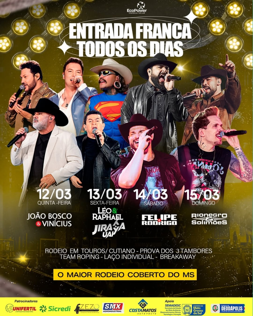 Deodápolis vive a partir desta semana mais um grande momento de tradição e entretenimento com o início do Arena Frigomar Rodeo Festival, evento que já se consolidou como um dos mais importantes do município e da região. A programação reúne rodeio profissional, grandes shows nacionais e atrações que movimentam a economia local e valorizam a cultura sertaneja. Realizado na Arena Frigomar, o evento acontece entre os dias 12 e 15 de março, reunindo milhares de pessoas de Deodápolis e de diversas cidades da região. Além de proporcionar lazer e entretenimento para a população, o rodeio também gera impacto positivo no comércio, hotéis, restaurantes e demais setores da economia local. A programação musical conta com grandes nomes da música sertaneja que prometem animar o público durante os quatro dias de festa: Além dos shows, o rodeio traz competições que são tradição nas arenas brasileiras, como montaria em touros, laço em dupla, laço individual, três tambores e breakaway roping, reunindo competidores de várias regiões e distribuindo mais de R$ 145 mil em premiação. Mais do que um espetáculo esportivo e musical, o Arena Frigomar Rodeo Fest reforça as raízes culturais do município, celebrando a tradição do rodeio e o espírito do interior. O evento já faz parte do calendário festivo de Deodápolis e se tornou um momento aguardado pela população, reunindo famílias, amigos e visitantes em noites de muita emoção, música e adrenalina na arena. Com estrutura ampliada, atrações de destaque e grande participação do público, o Arena Frigomar Rodeo Festival reafirma Deodápolis como um importante polo de eventos e cultura no Mato Grosso do Sul.