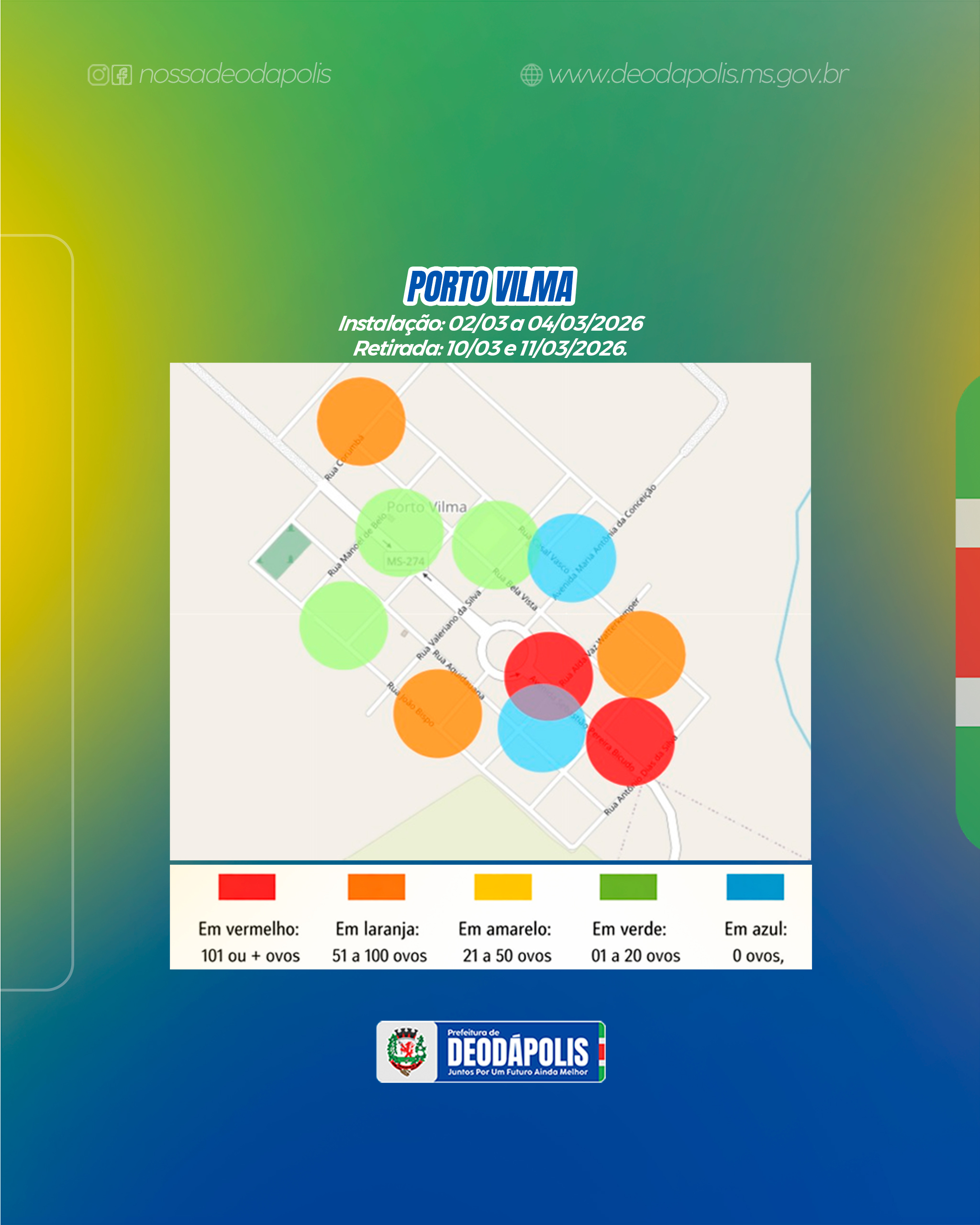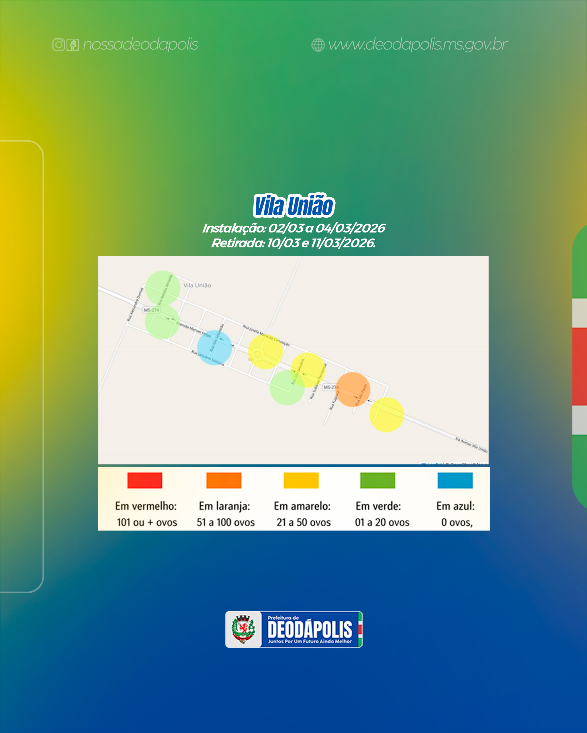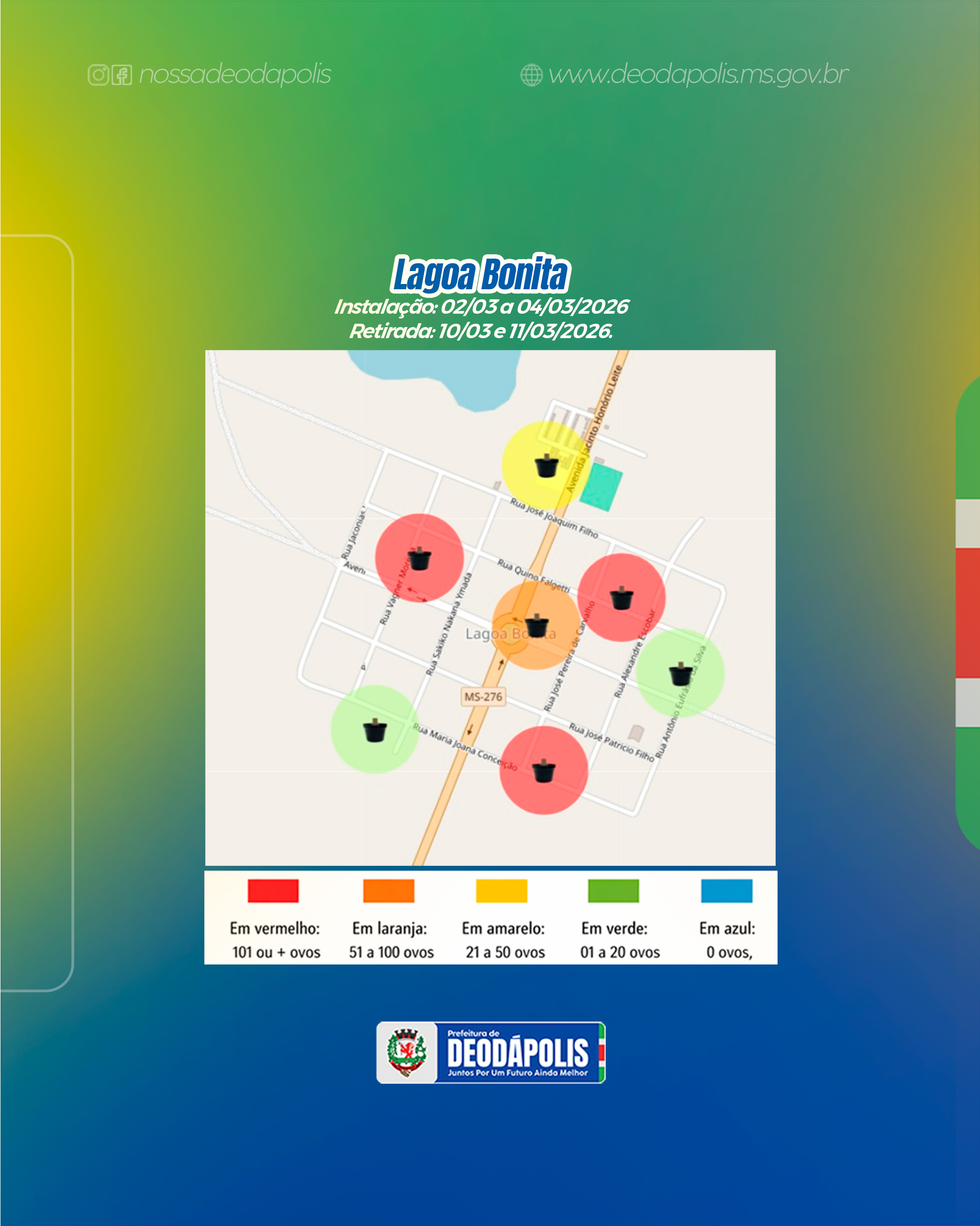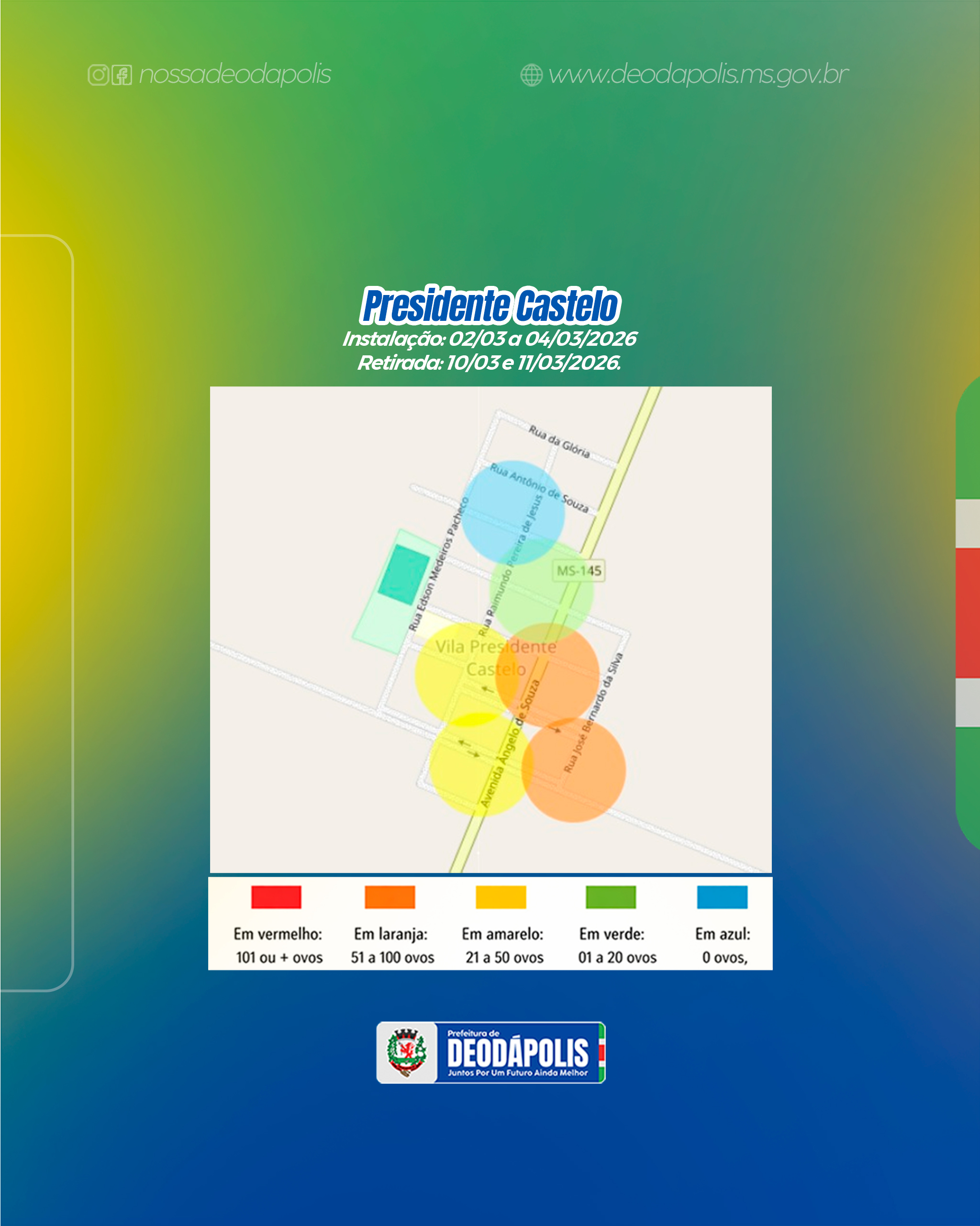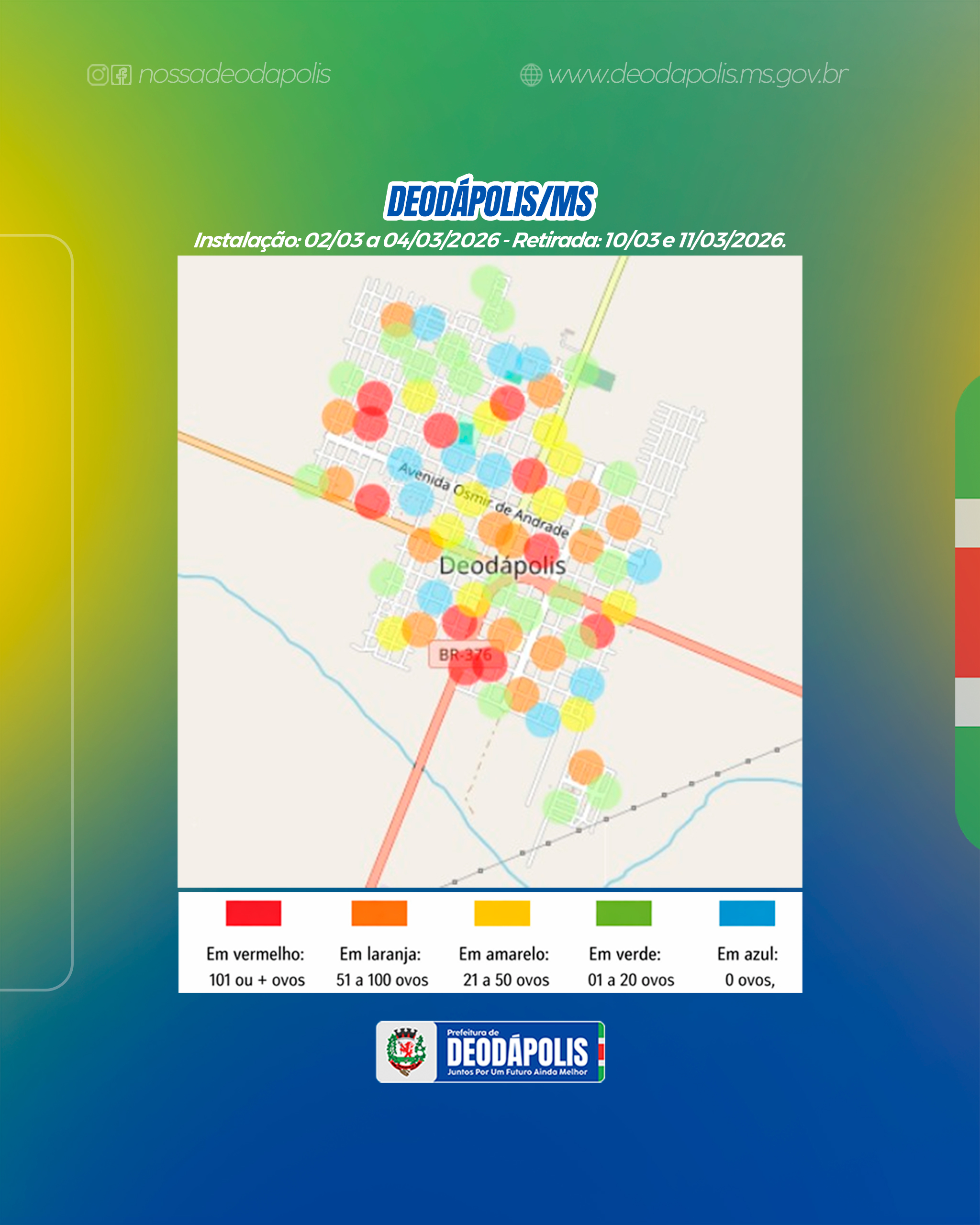 A Prefeitura de Deodápolis, por meio da equipe de Controle de Vetores, realizou o monitoramento por ovitrampas no município, com o objetivo de identificar a presença do mosquito Aedes aegypti, transmissor da dengue, chikungunya e zika. As ovitrampas são armadilhas utilizadas para coletar ovos do mosquito, permitindo mapear as regiões com maior incidência e direcionar de forma mais eficaz as ações de combate. A pesquisa foi realizada em março de 2026, com instalação das armadilhas entre os dias 02/03 e 04/03 e retirada nos dias 10/03 e 11/03. Os dados apontaram que as áreas destacadas em vermelho e laranja apresentam maior quantidade de fêmeas do mosquito, indicando maior risco de transmissão das doenças. O mapa de calor, disponibilizado à população, permite acompanhar essas regiões e reforça a necessidade de atenção redobrada nos locais com maior incidência. A Prefeitura destaca que o combate ao mosquito depende também da colaboração da população. Medidas simples fazem a diferença no dia a dia: • Não deixar água parada A administração municipal segue com o monitoramento contínuo e ações preventivas, reforçando o compromisso com a saúde pública e a proteção de toda a população. O combate à dengue é uma responsabilidade de todos.