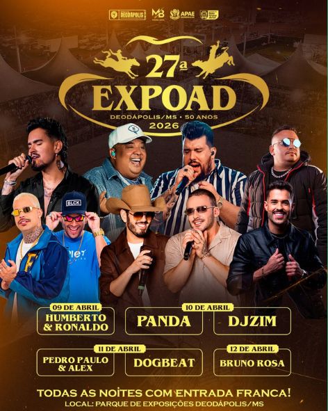 Deodápolis se prepara para viver um dos momentos mais marcantes de sua história com a realização da 27ª EXPOAD, uma edição especial que celebra os 50 anos de emancipação do município. O evento promete ser o maior já realizado, reunindo tradição, cultura, entretenimento e grandes atrações no Parque de Exposições. Com entrada franca todos os dias, a festa deve reunir moradores e visitantes de toda a região para celebrar meio século de história de Deodápolis, conhecida como a terra dos campeões. A programação musical já está confirmada e promete animar o público durante os quatro dias de festa. Programação de shows Outro grande destaque da festa é o tradicional rodeio em touros e cutiano, que promete muita adrenalina e emoção na arena, mantendo viva a tradição sertaneja que faz parte da história do município. No sábado, dia 11 de abril, a arena contará com uma presença especial. O cantor Pedro Paulo, da dupla Pedro Paulo e Alex, participará da festa como Embaixador do Rodeio, levando ainda mais animação e espetáculo para a arena e reforçando a valorização da cultura do rodeio. Também no sábado, 11 de abril, será realizada a tradicional Cavalgada da EXPOAD, um dos momentos mais aguardados do evento. A concentração terá início às 7h, com saída oficial às 10h, no Parque de Exposições, reunindo cavaleiros, comitivas e famílias em um grande encontro que celebra a tradição do campo. A programação também conta com o tradicional Concurso Rainha do Rodeio, que movimenta a cidade e valoriza a participação das jovens de Deodápolis. A grande final, que definirá a Princesinha e a Princesa do Rodeio, acontecerá na quinta-feira, dia 9 de abril, na arena do rodeio. A 27ª EXPOAD promete entrar para a história como a maior edição já realizada, reunindo tradição, música, rodeio e celebração em um momento especial para toda a população. A festa marca os 50 anos de Deodápolis, fortalecendo o orgulho e a identidade de um município que valoriza suas raízes e tradições.
